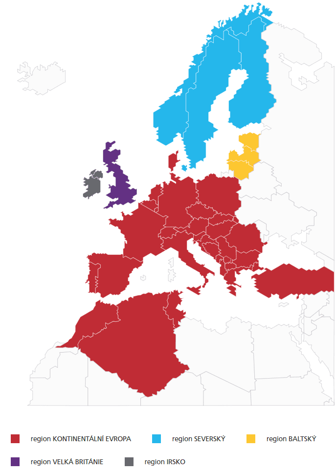 Mapa Synchronních zón ENTSO-E. neboli propojených oblastí pracujících se synchronní frekvencí. Zdroj: ČEPS