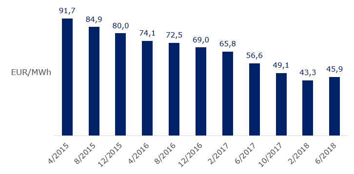 Postupem času provozní podpora solárních elektráren v Německu výrazně poklesla s tím, jak země přešla v případě velkých pozemních instalací z pevných feed-in-tarifů na aukce, ve kterých se výsledná výše ceny soutěží. Od první aukce z dubna 2015 klesla výše provozní podpory na polovinu.