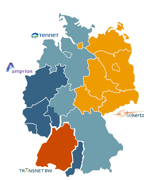 Kontrolní zóny jednotlivých provozovatelů přenosové soustavy v Německu. Zdroj: PRÄQUALIFIKATIONS-PORTAL