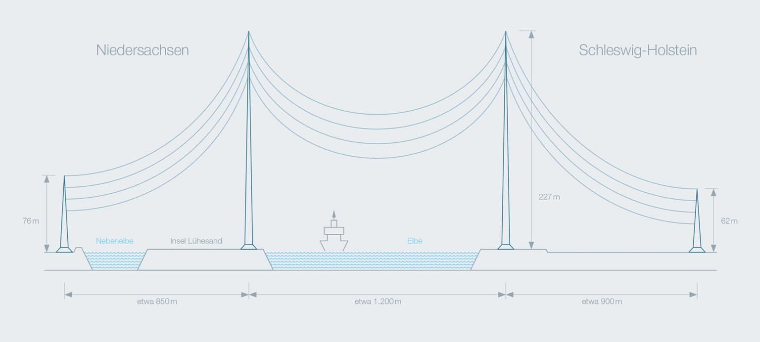 Elbekreuzung spojuje za využití nejvyšších elektrických stožárů v Evropě dvě největrnější spolkové země Německa, Dolní Sasko a Šlesvicko-Holštýnsko. Zdroj: TenneT