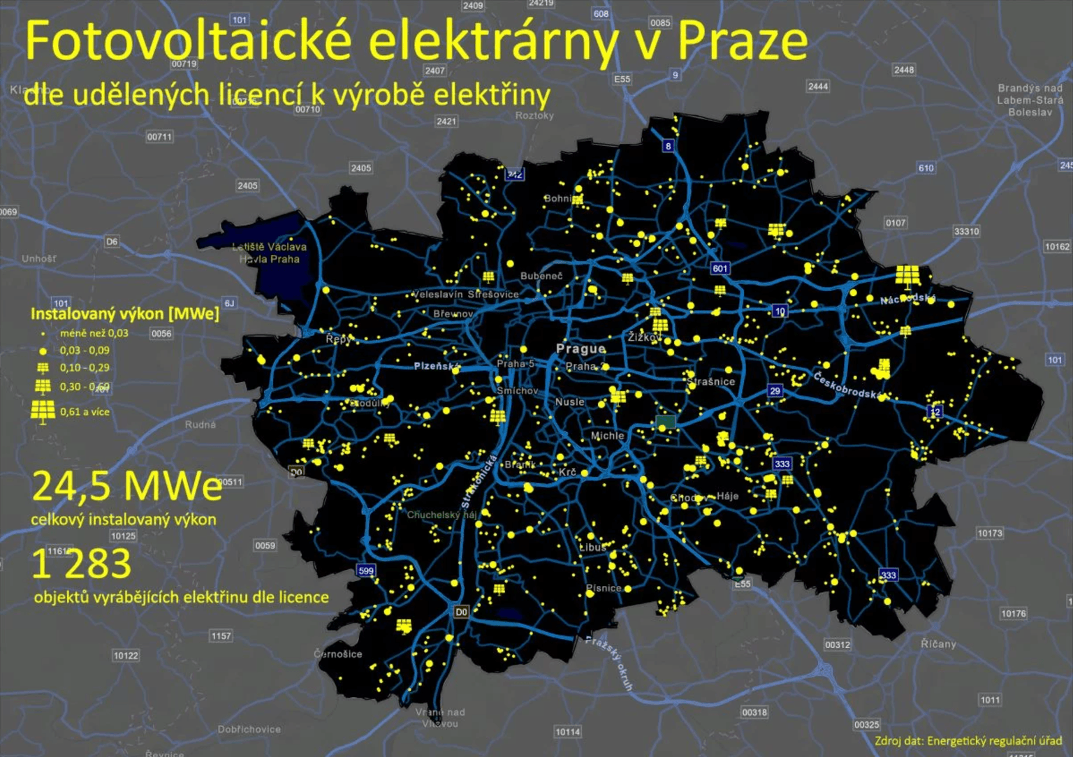 Na území hlavního města Prahy se nachází necelých třináct set fotovoltaických elektráren, od těch nejmenších na střechách po velké zdroje na okrajích města. Jejich celkový výkon dosahuje 24,5 megawattu, což je o třetinu méně než v Brně.