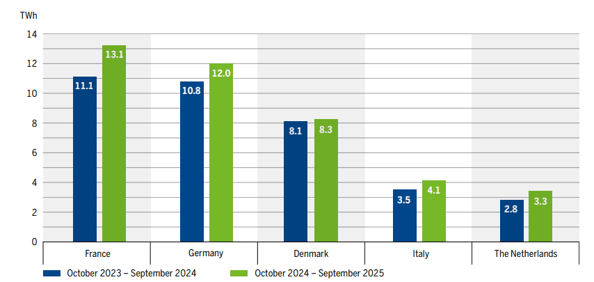 Největší část loňského růstu připadla na lídra v této oblasti, kterým je Francie. Ta vtlačila v uplynulém plynárenském roce do plynárenské soustavy 13,1 TWh biometanu, což je meziročně o 2 TWh více. Druhým největším trhem bylo Německo s 12 TWh (meziročně o 1,2 TWh více). Mezi země s "terawatthodinovými" objemy vtlačeného biometanu patří ještě Dánsko (8,3 TWh), Itálie (4,1 TWh) a Nizozemsko (3,3 TWh).