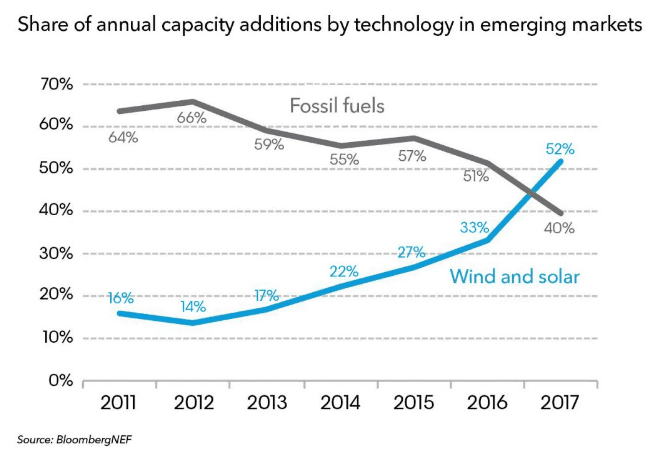 Tato změna je poháněna zejména klesajícími náklady čistých technologií, zejména větrných a solárních v kombinaci s velmi vhodnými přírodními podmínkami v mnoha rozvojových zemích. Elektrárny vyrábějící elektřinu z obnovitelných zdrojů pak v dotčených oblastech mohou konkurovat elektrárnám na fosilní paliva i bez dotací.