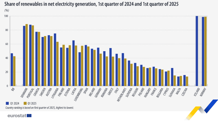 Státy Evropské unie měly v prvním čtvrtletí letošního roku dohromady 42,5% podíl elektřiny z OZE na celkové čisté výrobě elektřiny. Ve srovnání s prvním kvartálem roku 2024 se jedná o pokles o 4,3 p.b.