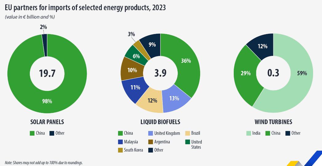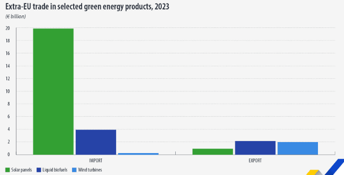 Podle zveřejněných statistik tvořily naprostou většinu výše uvedené hodnoty dovozu zelených technologií a paliv do EU v roce 2023 solární panely, a to 19,7 miliardy eur. Přestože množství dovezených solárních panelů vzrostlo meziročně o 5 %, hodnota dovozu klesla díky poklesu cen o 12 %.