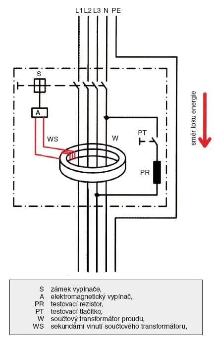 - princip činnosti proudového chrániče (vysvětleno na čtyřpólovém zapojení v soustavě TN-S),