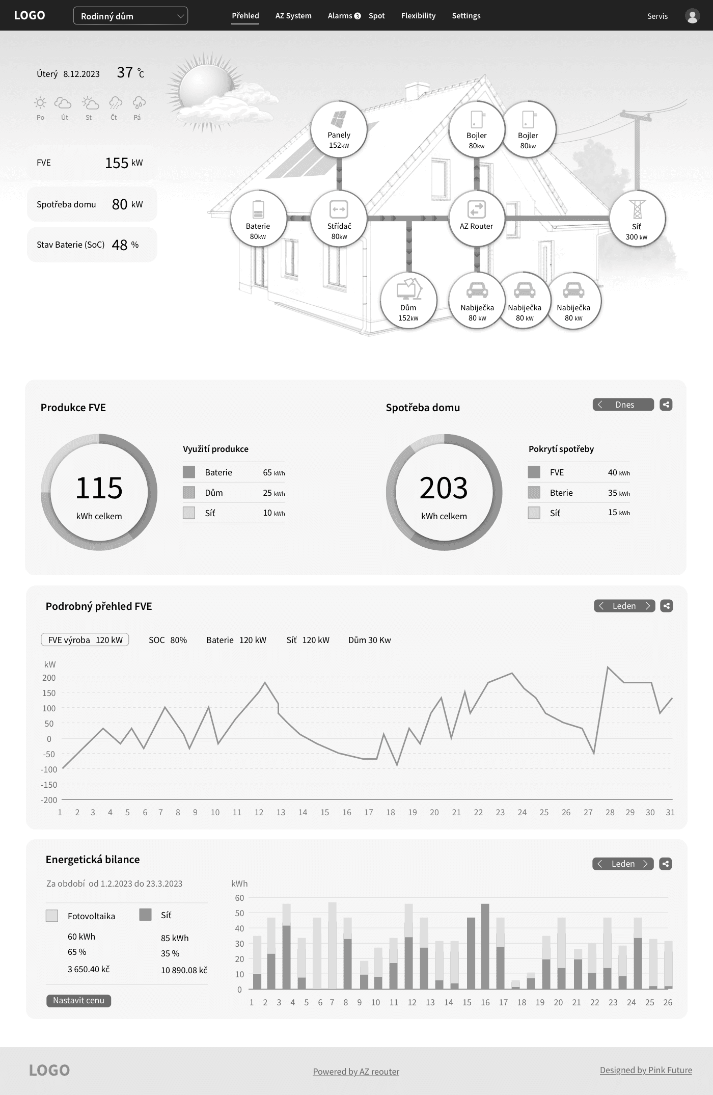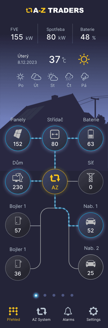 Srdcem a mozkem chystané monitorovací aplikace bude řídící jednotka A-Z ROUTERu, která je už dnes v našich instalacích hlavním elementem celé fotovoltaické elektrárny. Krom ovládání nabíjecích stanic pro elektromobily a řízení ukládání přebytků vyrobené, ale nespotřebované energie do baterie či do ohřevu TUV, bude zásadní update zahrnovat kompletní ovládání střídače, monitoring baterií a jednotek pro ukládání přetoků energie do ohřevu vody.