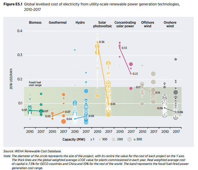 Podle zprávy IRENA se elektřina z obnovitelných zdrojů stává čím dál tím konkurenceschopnější. Náklady technologií pro solární a větrné elektrárny v posledních letech stabilně klesají. Podobně, náklady na výrobu elektřiny ve vodních a geotermálních elektrárnách, ve větrných elektrárnách na pevnině a z biomasy se podle dat IRENA pohybovaly v rozmezí nákladů na výrobu elektřiny z fosilních zdrojů.