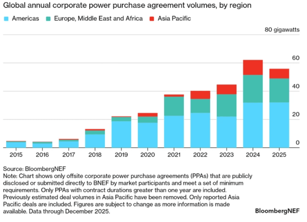 Objem uzavřených dlouhodobých smluv na nákup čisté elektřiny (Power Purchase Agreement - PPA) v loňském roce poprvé po téměř 10 letech setrvalého růstu meziročně klesl. Vyplývá to z analýzy výzkumníků z BloombergNEF (BNEF), podle které uzavřely v loňském roce korporace smlouvy na celkem 55,9 GW výkonu z čistých zdrojů. To je o 10 % méně ve srovnání s rekordním rokem 2025.