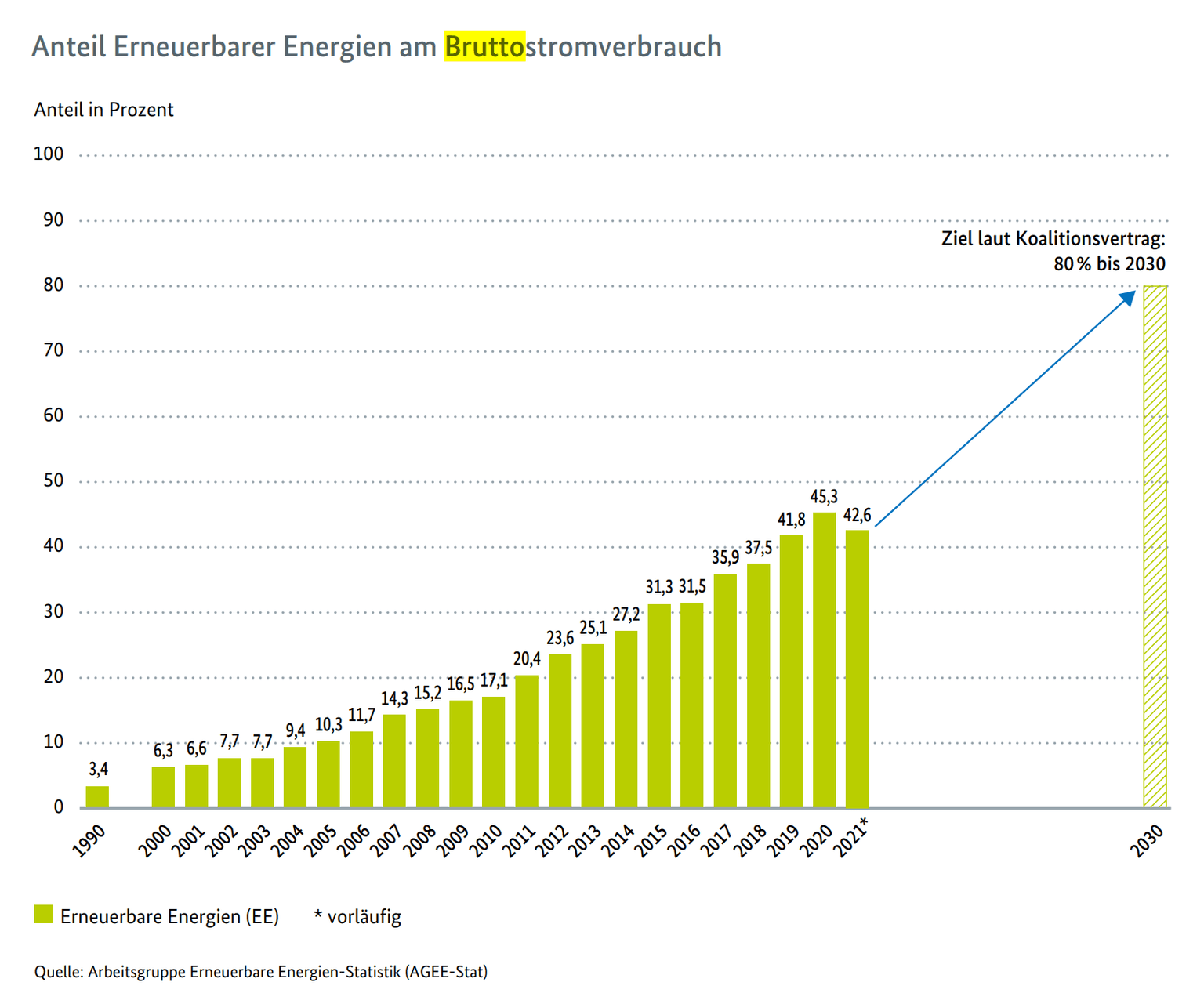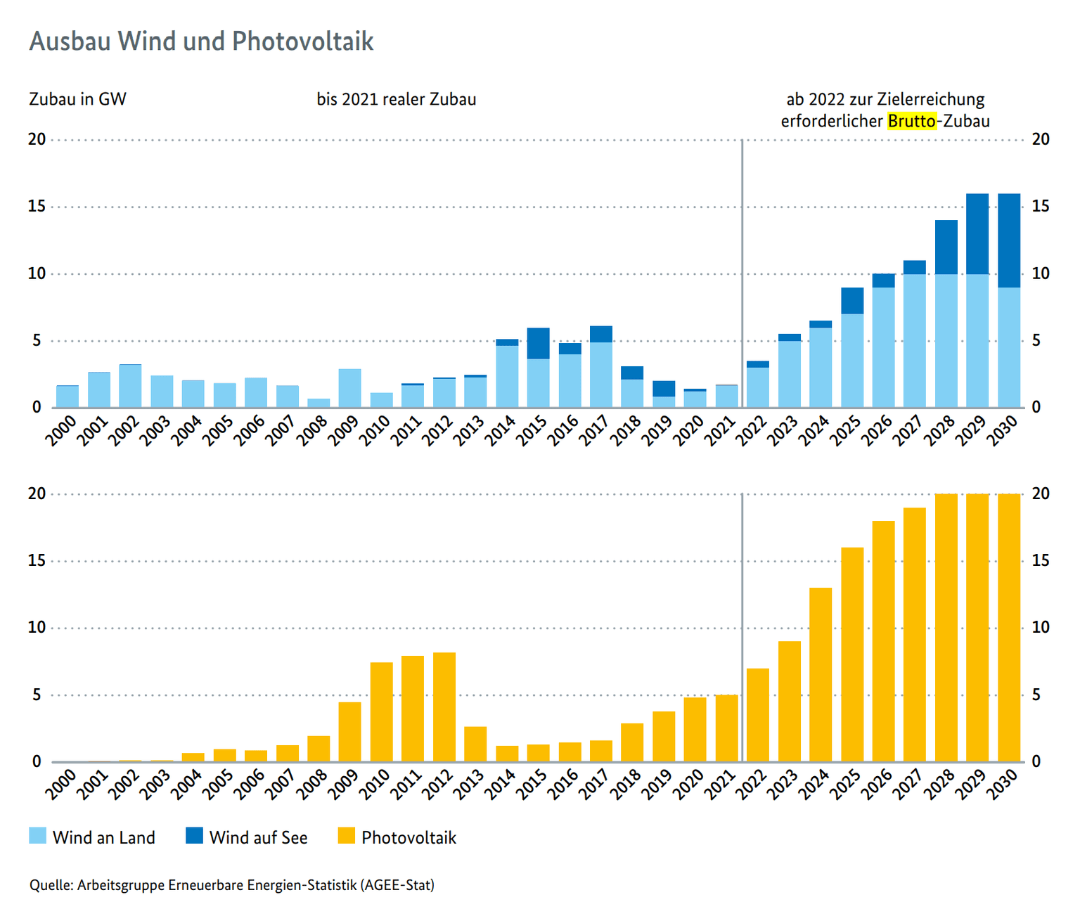 Z cílů rozvoje OZE sjednaných v koaliční dohodě vyplývá, že v roce 2030 bude zapotřebí více než 100 GW instalovaného výkonu větrných elektráren na pevnině. Pokud se započítají elektrárny jejichž provoz bude ukončen, bude muset Německo za méně než deset let více než zdvojnásobit současný instalovaný výkon těchto zdrojů.