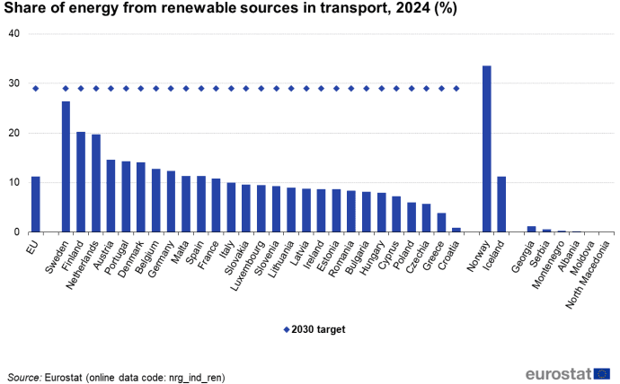 Mezi země s největším podílem OZE v dopravě patří tradičně Švédsko (26,4 %) a Finsko (20,3 %). Na uvedené země se začalo v roce 2024 dotahovat Nizozemsko, které vykázalo 19,8% podíl, což představuje meziroční nárůst o více než 6 p.b.