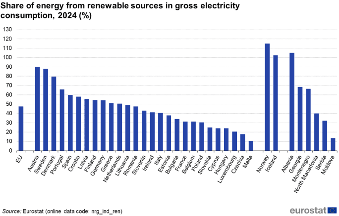 Podíl OZE na hrubé konečné spotřebě energie vzrostl v roce 2024 meziročně o 0,7 procentního bodu (p.b.) na 25,2 %. Nejvyššího podílu dosáhlo tradičně Švédsko, a to 62,8 % (meziročně o 3,6 p.b. méně). Nejnižšího naopak Belgie se 14,3 % (meziročně o 0,3 p.b. méně). Česká republika měla v roce 2024 podíl OZE na hrubé konečné spotřebě ve výši 19,2 %, a patřila tak tradičně mezi země s nižším podílem.