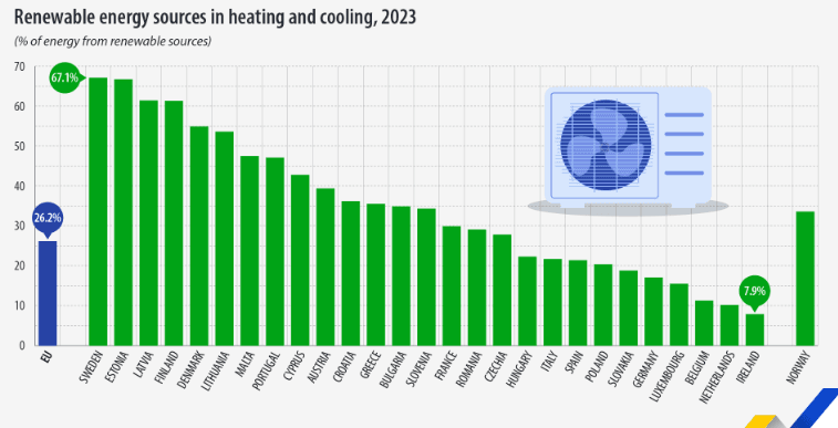 Eurostat uvedl, že hrubá konečná spotřeba obnovitelné energie v sektoru vytápění a chlazení roste zejména díky rostoucímu využití biomasy a tepelných čerpadel. Úřad dále připomněl, že evropská legislativa požaduje po členských státech, aby navyšovaly své podíly OZE ve vytápění a chlazení nejméně o 0,8 p. b. v letech 2021 až 2025 a následně o 1,1 p. b. mezi lety 2026 až 2030.