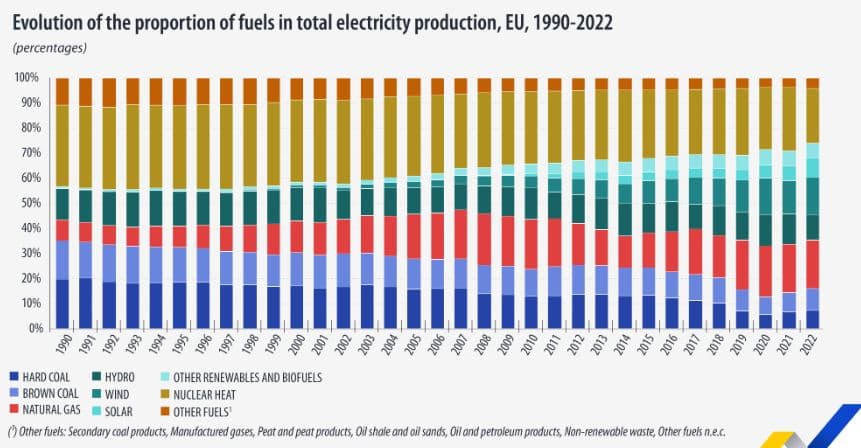 Eurostat dodal, že poslední zemí, která se ve větší míře spoléhá ve výrobě elektřiny na černé uhlí, je Polsko. Pokud jde o hnědé uhlí, to využívá k výrobě elektřiny 9 zemí EU. Celková výroba elektřiny z tohoto zdroja činila v roce 2022 necelých 242 TWh