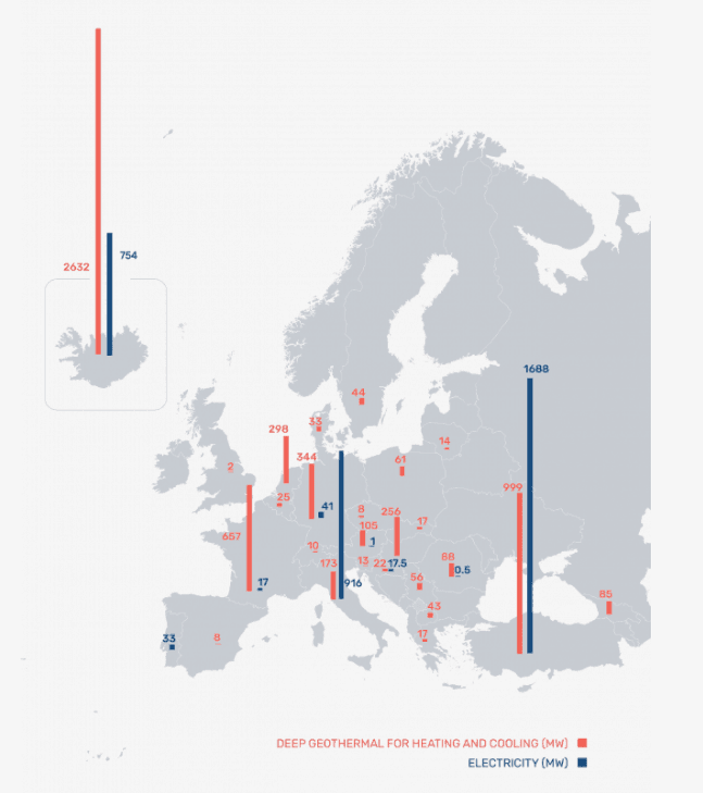 Geotermální elektrárny využívají tepla pod povrchem země k výrobě elektřiny. V Evropě mezi lety 2010 až 2019 vzrostl instalovaný výkon těchto elektráren z 1,5 GW na 3,5 GW. Tento instalovaný výkon pochází z 139 elektráren umístěných po celé Evropě včetně Turecka. Největší instalovaný výkon geotermálních elektráren v Evropě má dle EGEC Turecko s 1 688 MW, následuje Itálie s 916 MW a Island s 754 MW.