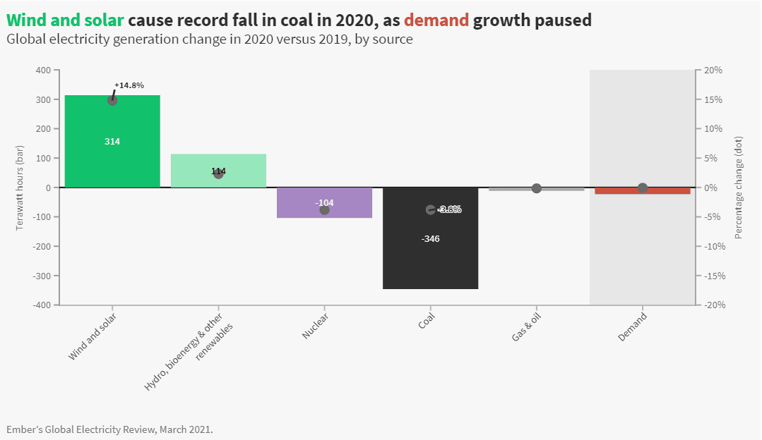 Výroba elektřiny z uhlí dosáhla rekordního meziročního poklesu o 3,8 % (346 TWh). To je více než výroba elektřiny v roce 2020 ve Spojeném království. Velké poklesy výroby z uhlí byly zaznamenány například v USA (o 20 %), v EU (o 20 %) a v Indii (o 5 %). Globálně vzrostla výroba ve vodních elektrárnách o 94 TWh, výroba z jádra naopak poklesla o 104 TWh, výroba ze zemního plynu a ropy poklesla o 12 TWh.