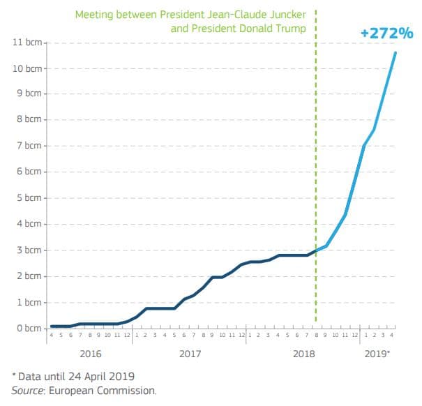 Koncem srpna minulého roku navštívili Spojené státy americké obchodní zástupci Evropské unie. Jejich hlavním cílem bylo navázat na energetickou dohodu, kterou mezi sebou započali předseda Evropské komise Jean-Claude Juncker a prezident USA Donald Trump při svém setkání 25. července 2018. Od té doby se dovoz zkapalněného zemního plynu (LNG) do Evropy téměř čtyřnásobně zvýšil.