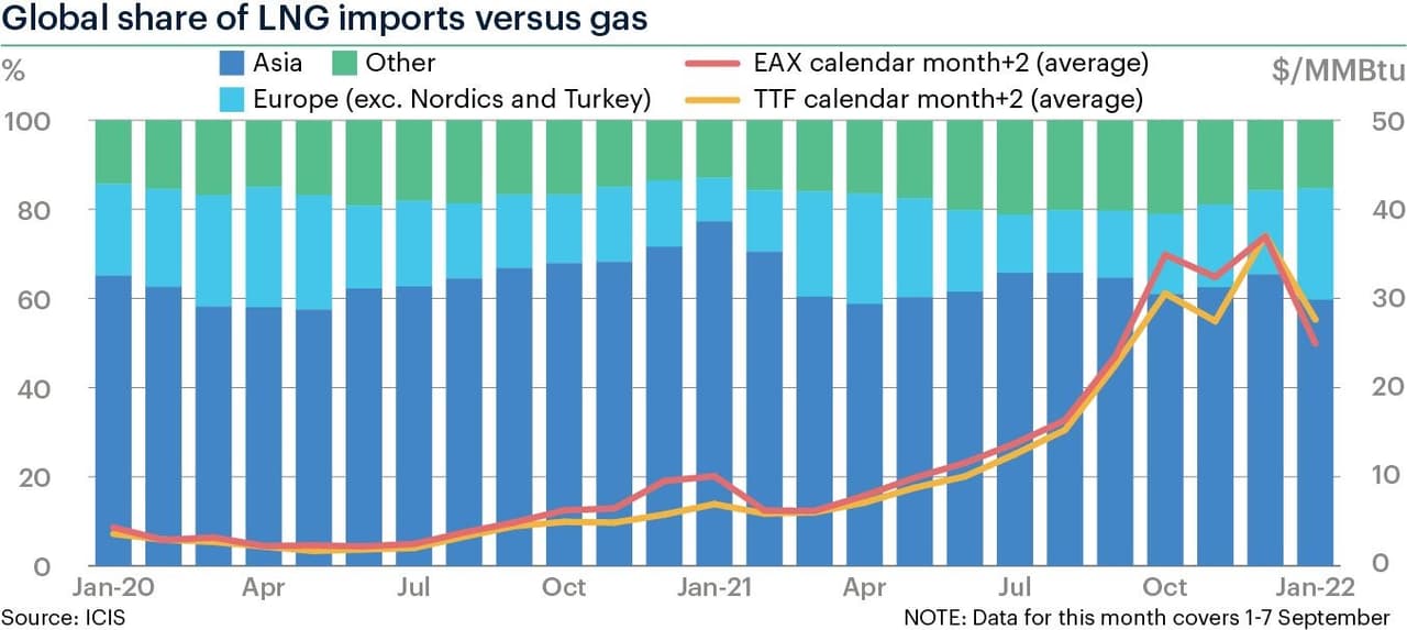 Snižující se poptávka vedla k tomu, že Asie zaujímá menší podíl na celosvětovém dovozu LNG, který v lednu představoval 59 %. To představuje devítiměsíční minimum a meziroční pokles o 18 procentních bodů.
