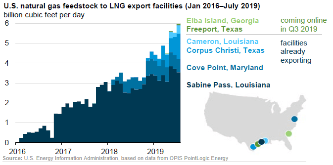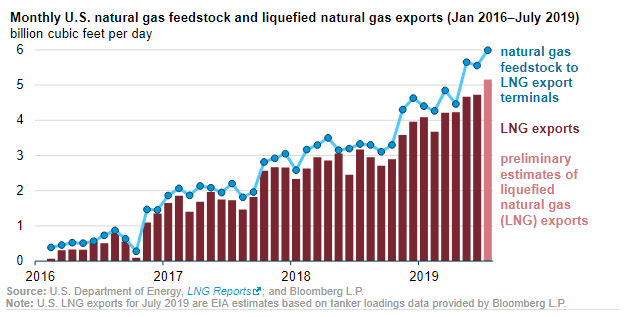 Podle odhadů EIA bylo v červnu a červenci 2019 dosaženo rekordů v exportu LNG. V červnu bylo podle odhadů exportováno 4,8 Bcf/d (zhruba 136 mcm/d) a v červenci poté 5,2 Bcf/d (zhruba 147 mcm/d).