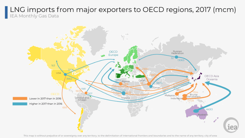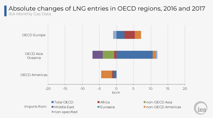 Importy plynu do zemí OECD ze zahraničí vzrostly mezi lety 2016 a 2017 o 5,1 % a jejich celkový objem byl téměř 105 miliard kubických metrů plynu. OECD Evropa importovala o 6,8 % více plynu než v roce 2016. LNG importy v celém regionu OECD vzrostly o 2,9 %, především díky nárůstu importů z USA (+439,9 %) a z Austrálie (+18,1 %). Importy LNG naopak poklesly z exportujících nečlenských zemí OECD jako například z Kataru (-5,4 %), Indonésie (-12,3 %) a z Malajsie (-4,2 %).
