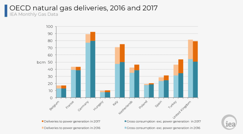 Nejvyšší nárůst hrubých dodávek v OECD Evropě byl dle dat IEA v Turecku (+15,3 %), v Nizozemsku (+10,5 %) a v Itálii (+6 %), a to vzhledem ke zvýšené spotřebě plynu v oblasti výroby elektřiny a tepla. Zároveň měla na vyšší poptávku v regionu dopad chladná zima. Podobně menší množství dešťových srážek a větrnost snížily výrobu elektřiny ve vodních a větrných elektrárnách, což vedlo k vyšším dodávkám plynu do Španělska (+8,7 %) a Portugalska (+21,2 %).