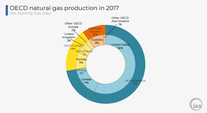 Nejmenší nárůst produkce ze všech regionů OECD byl zaznamenán v Evropě, o 0,4 %. Největší pokles těžby plynu byl v Nizozemsku (-13,2 %), především kvůli rozšíření omezení produkce v ložisku Groningen. Nicméně tento pokles byl vyrovnán nárůstem produkce v Norsku o 6,1 %, neboť Norsko tvoří 52,4 % veškeré produkce evropských zemí OECD. V roce 2017 Norsko vytěžilo zhruba 128 miliard kubických metrů plynu.