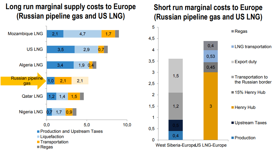 Z dat prezentovaných v říjnu 2018 výzkumnicí Tatianou Mitrovou ovšem vyplývá, že jsou náklady amerického LNG vyšší. Zároveň ovšem Gazprom nezpochybnitelně bere americké LNG v potaz. V uplynulých letech došlo k mnohým změnám v dodávkových kontraktech a byla kupříkladu zahrnuta flexibilnější cenotvorba nebo došlo k rozvinutí ruského export LNG.