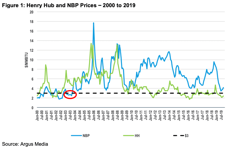 Naposledy se přitom na britském spotovém trhu NBP (z angl. National Balancing Point) cena zemního plynu pohybovala pod 3 USD/MMBtu v září 2003. Od té doby se pohybovala podstatně výše, přičemž na přelomu let 2005 a 2006 se cena vyhoupla až na cca 18 USD/MMBtu.