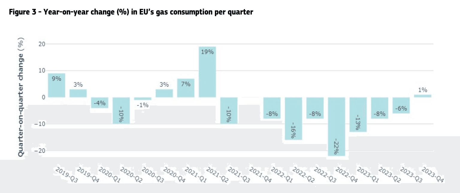Spotřeba zemního plynu v Evropě za celý rok 2023 poklesla k hodnotě 330 mld. m3 zemního plynu. Oproti roku 2021, kdy lze ještě tvrdit, že spotřeba plynu nebyla tak silně ovlivněna energetickou krizí, klesla o pětinu (z 413 mld. m3).