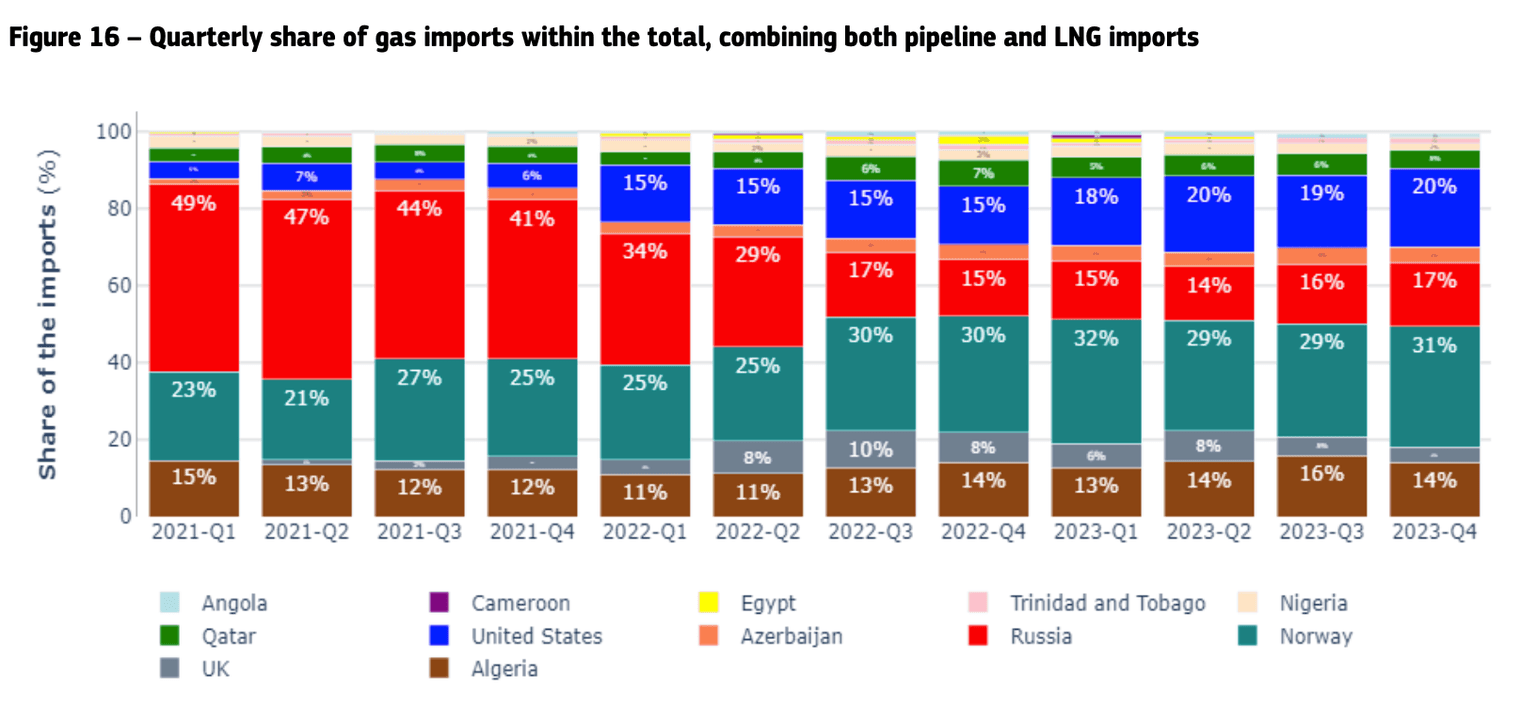Přes zvýšení dovozu ruského plynu v posledním čtvrtletí roku 2023 je patrné, že jeho dovoz v delším období znatelně poklesl. Ještě na počátku roku 2021 totiž téměř polovina dovezeného plynu měla svůj původ v Rusku. Po energetické krizi jej ovšem částečně nahradil zkapalněný zemní plyn a také vyšší dodávky z Norska.