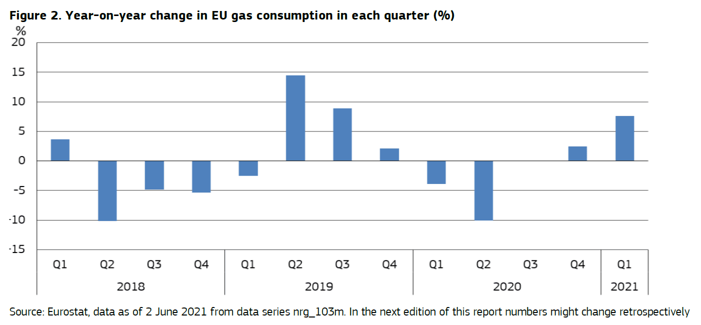 Podle dat Komise spotřeba zemního plynu v zemích EU27 v Q1 2021 v meziročním srovnání vzrostla o 7,6 % na 141,8 miliard metrů krychlových (bcm). Důvodem zvýšené spotřeby byla období chladného počasí, díky kterým byla vyšší poptávka po teplu v residenčním sektoru, a také o 3,4 % vyšší poptávka v elektroenergetickém sektoru. Podle zprávy Komise mohla k vyšší poptávce v residenčním sektoru přispět rozšířená praxe práce z domova (tzv. home office) v důsledku pandemie koronaviru.