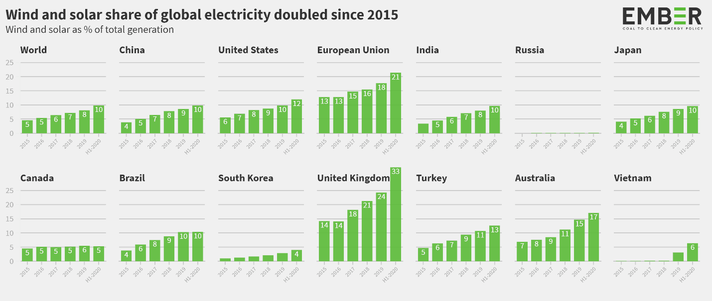 Pro zajímavost, plnění závazků Pařížské dohody a vývoj zavádění obnovitelných zdrojů v jednotlivých státech zobrazuje následující diagram. Je zde vidět, že celosvětově se podíl obnovitelných zdrojů na celkové výrobě od roku 2015 zdvojnásobil.