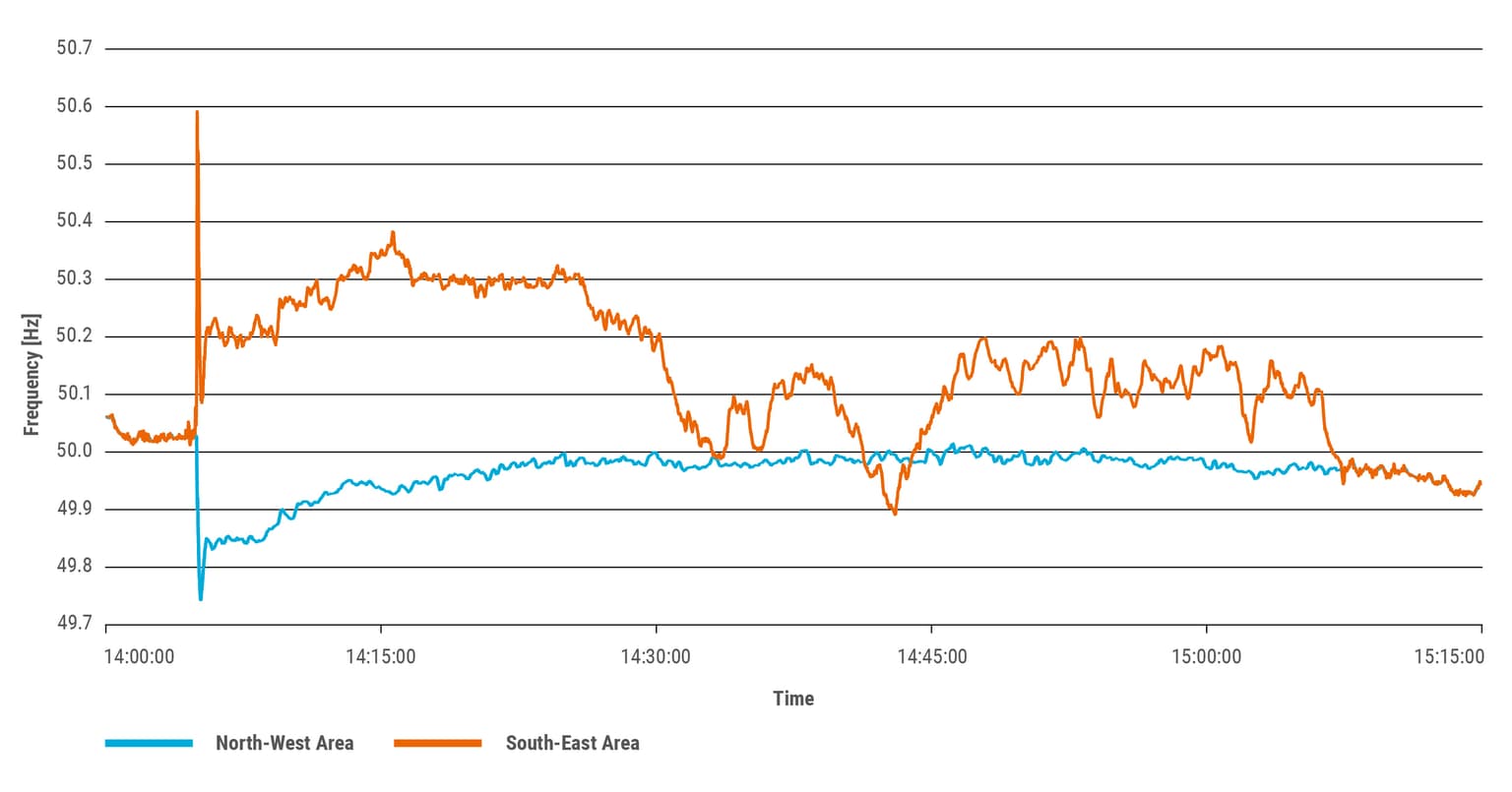 Mezi 14:30 SEČ a 15:06 SEČ frekvence v jihovýchodní oblasti kolísala mezi 49,9 Hz a 50,2 Hz kvůli poměrně malé rozloze oblasti, kde bylo odpojeno také několik výrobních jednotek. V severozápadní oblasti vzhledem k její poměrně velké velikosti kolísala frekvence mnohem méně a zůstala blízko nominální hodnoty. Chování frekvence je předmětem dalšího podrobného zkoumání.