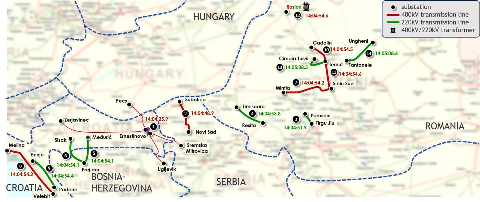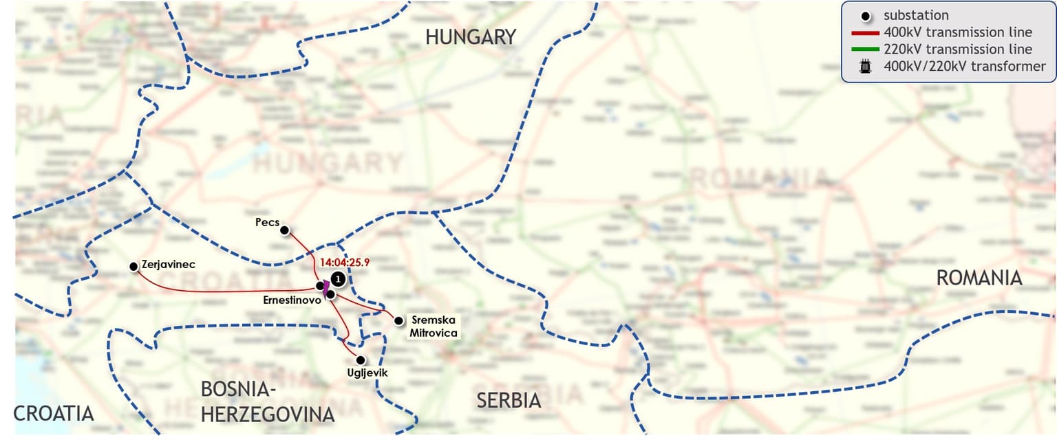 Analýza posloupnosti událostí dospěla k závěru, že počáteční událostí bylo ve 14:04:25,9 SEČ vypnutí 400kV propojení přípojnic v chorvatské rozvodně Ernestinovo nadproudovou ochranou. To mělo za následek oddělení dvou přípojnic v rozvodně Ernestinovo, které následně oddělilo severozápadní a jihovýchodní tok elektrické energie v této rozvodně.