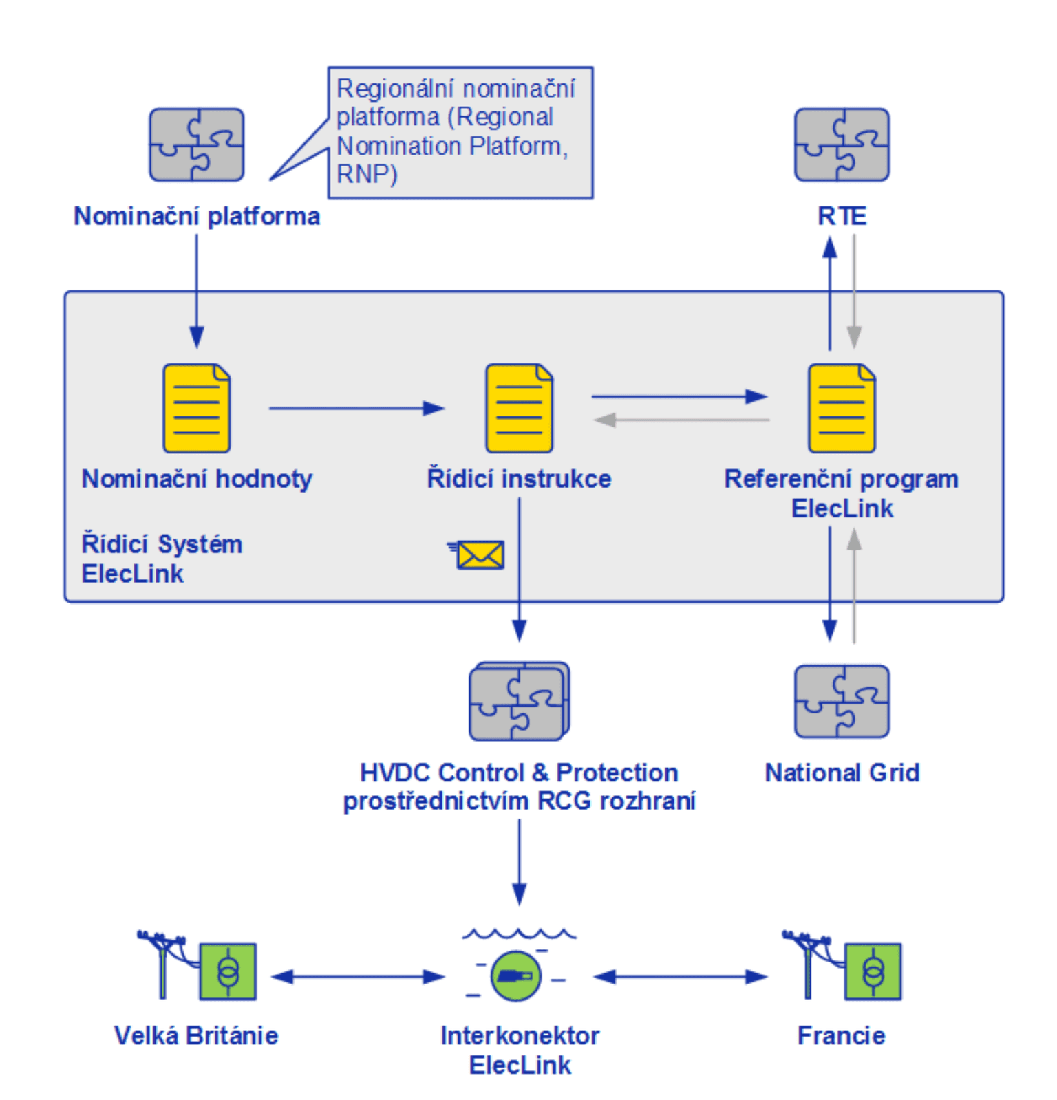 - Po schvalovacím procesu jsou objednávky energií předány do systému řízení a ochrany HVDC (HVDC Control & Protection System), jehož prostřednictvím dostává interkonektor ElecLink pokyny pro reálný provoz.