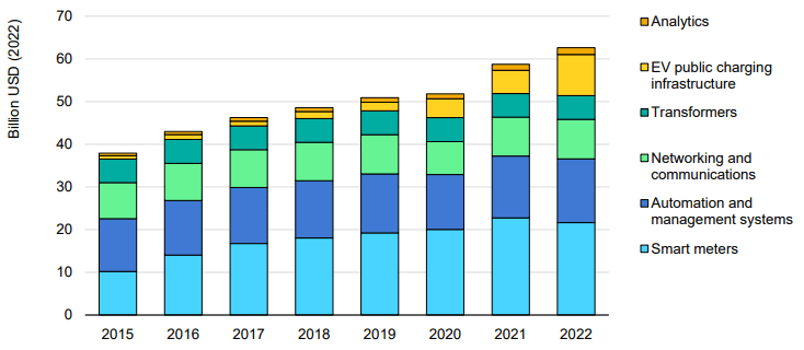 Investice do digitálních technologií na úrovni infrastruktury mezi lety 2015-2022. Zdroj: Mezinárodní energetická agentura (IEA)