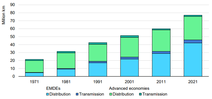 Podle čísel za poslední dekády právě u distribučních sítí docházelo k největšímu rozvoji. Ty představovaly globálně až 93 % nového objemu ze zhruba 80 milionů kilometrů nově postavené infrastruktury (počítáno mezi lety 1971-2021).