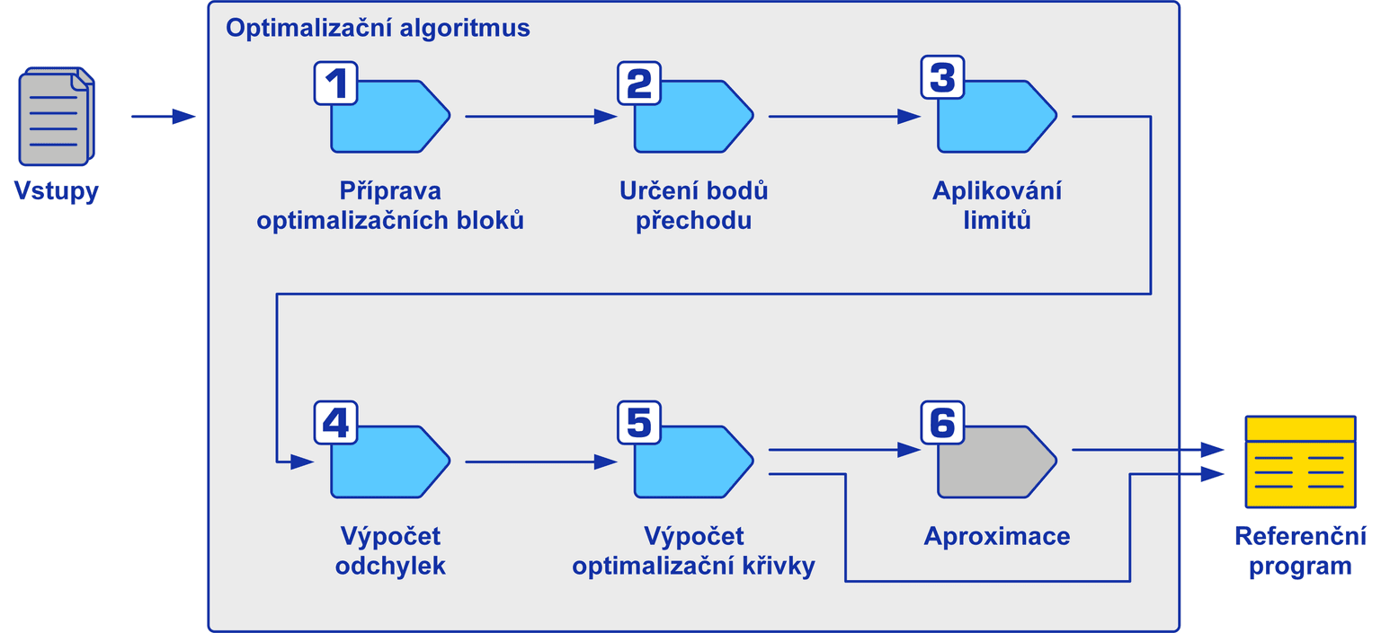 Referenční program se vždy generuje pro konkrétní časový úsek a tento úsek se dělí na jednotlivé podintervaly – optimalizační bloky. V prvním kroku algoritmu se načtou a určí hodnoty potřebné k výpočtu programu pro každý optimalizační blok. Pro optimalizační blok je minimalizována odchylka a obvykle je jeho délka rovna délce vypořádací periody. Atributy jednotlivých bloků se mohou lišit (např. vlivem konfigurace), proto první krok zajišťuje jejich korektní nastavení.