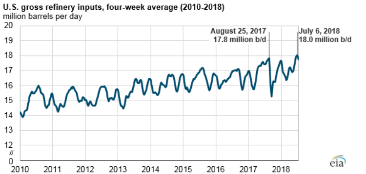 Ve čtyřtýdenním průměru (období končící posledním týdnem v červenci 2018) bylo dodáváno do amerických rafinerií ke zpracování více než 18 milionů barelů surové ropy denně (b/d). Vysoká produkce rafinerií je zapříčiněna domácí a mezinárodní poptávkou po motorovém benzínu a topném oleji.