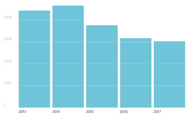 Pokles pracovních sil v britském ropném sektoru za poslední čtyři roky je markantní. Zdroj: The Guardian, na základě informací poskytnutých Oil & Gas UK.