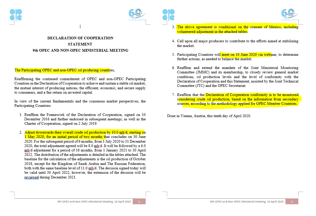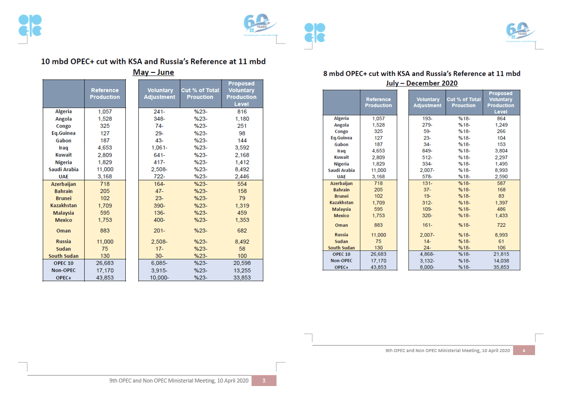 Předběžná dohoda OPEC by vedla ke snížení produkce ropy o přibližně 10 milionů barelů denně v květnu a červnu a znamenala by snížení těžby v rámci skupiny o 23 %. Saúdská Arábie a Rusko, největší těžaři ve skupině, by každý snížili produkci na asi 8,5 milionů barelů denně.