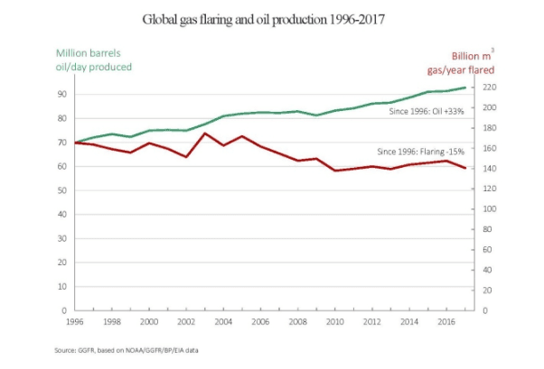 Doposud byl učiněn pouze velmi malý pokrok v eliminaci pálení zemního plynu jako vedlejšího produktu těžby ropy. A to i přesto, že se touto činností plynem plýtvá a znečišťuje okolí. V roce 2017 pálení plynu sice pokleslo oproti předchozímu roku asi o 5 %, ale hlavním důvodem bylo nižší pálení plynu v Rusku způsobené změnou těžených ložisek ropy. Eliminovat pálení plynu do roku 2030 si klade za cíl iniciativa Světové banky.