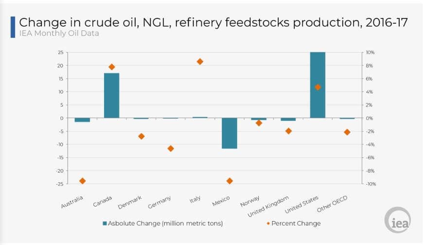 Spojené státy americké zažily i navzdory hurikánu Harvey největší nárůst produkce v absolutním vyjádření a zvýšily svou produkci o 25 milionů tun (4,7 %). Kanadská produkce měla nárůst o 7,8 %, a to i díky zotavení po požárech v těžařské provincii Alberta. Na druhou stranu Mexiko zažilo největší pokles mezi zeměmi OECD, když produkce ropy se snížilo o 9,6 %.