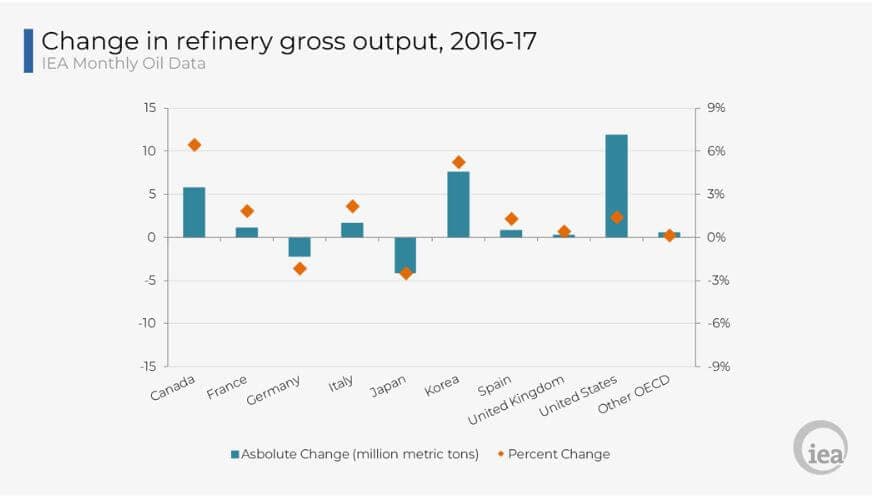 Celková produkce rafinerií v zemích OECD se zvýšila za rok 2017 o 1,2 % (23,2 milonů tun). Produkce EU vzrostla o 1,9 % i navzdory požárům v nizozemské rafinerii Pernis a v německé rafinerii Leuna. Benzin byla jediná kategorie ropných produktů, která zaznamenala pokles, konkrétně o 1,2 %.