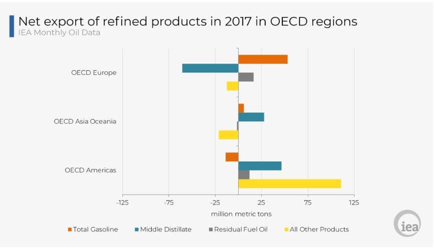 Zvýšení dovozu bylo zejména z Íránu (43,4 %) a z Libye (30,3%), zatímco pokles vývozu do OECD zaznamenala Angola, a to o 37,4 %. Saúdská Arábie a Rusko snížily svůj vývoz do OECD o 4,5 %, respektive o 1,6 %, ale i tak si udrželi největší podíl na trhu v tomto sektoru. Velký pokles zaznamenal vývoz topného oleje do zemím OECD v celkové hodnotě 19,9 %. OECD země jsou však čistým vývozcem rafinovaných ropných produktů s meziročním nárůstem 5,4 %.