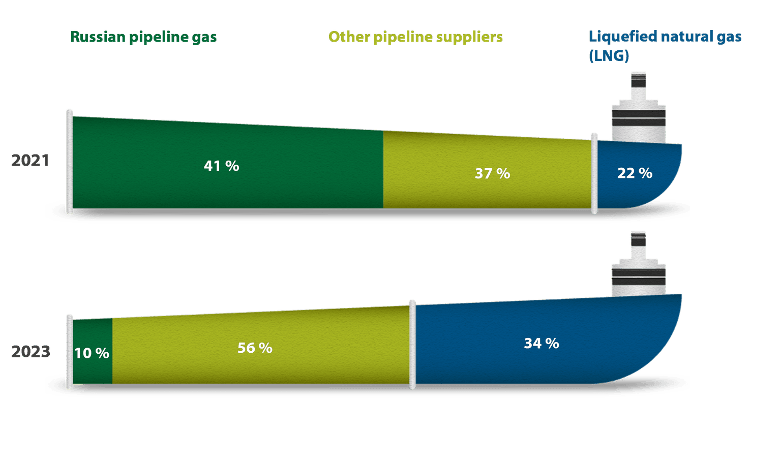 Zdroj: ECA, založeno na datech Eurostatu. Závislost EU na ruském plynovodním plynu 2021 vs 2023