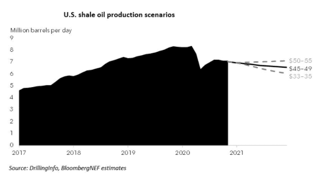 Podle BNEF se status tzv. swing producenta přesune z USA s břidlicovou ropou zpět k OPEC+. S propadem cen ropy v 2020 se propadla také těžba ropy v hlavních břidlicových ložiscích USA – meziročně o 16 % ve srovnání s průměrným meziročním růstem o 22 % v letech 2017-2019. Američtí producenti se nechali slyšet, že se proto v roce 2021 soustředí především na snižování dluhů než na investování. Z toho důvodu lze očekávat, že těžba břidlicové ropy by v 2021 zůstala na stejné úrovni, případně velice mírně vzrostla.