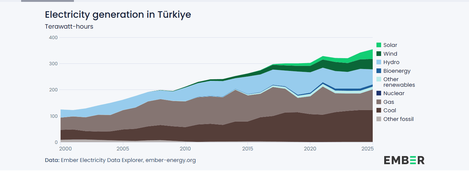 Turecká výroba elektřiny stála v posledních pětadvaceti letech na trojici uhlí, plyn a voda. Se stoupající poptávkou po elektřině se postupně do mixu začaly přidávat i další zdroje. Signifikantního nástupu se v posledních letech dočkaly i solární a větrné zdroje. Podle think tanku Ember dosáhl jejich společný podíl na výrobě elektřiny minulý rok 22 %. Zejména solární energetika v Turecku narostla od roku 2020 více než trojnásobně.