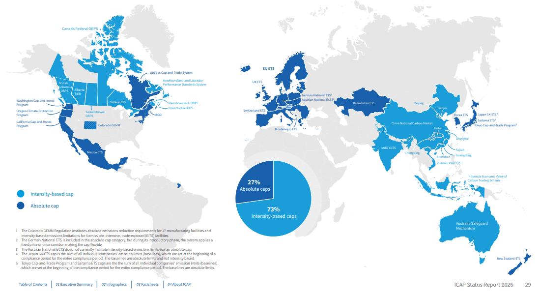 Základním rozdílem je, zda je systém založen na intenzitě (73 %), nebo na absolutním stropu (27 %). Systémy založené na absolutním stropu (například EU ETS či systém, na který chce teď přejít Čína) jsou jednodušší, ale přísnější. Fungují na principu zastropování emisí – tedy stanovení počtu tun CO₂, které lze vypustit do atmosféry, a vydáváním příslušného počtu povolenek. Cokoliv vypuštěno bez povolenky je penalizováno.