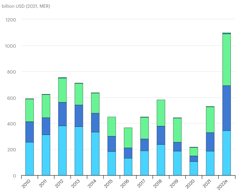 Dotace na spotřebu fosilních paliv dle zdroje v letech 2010-2022. Světle modrá: ropa; tmavě modrá: zemní plyn; světle zelená: elektřina; tmavě zelená: uhlí. Zdroj: IEA Fossil Fuels Consumption Subsidies 2022